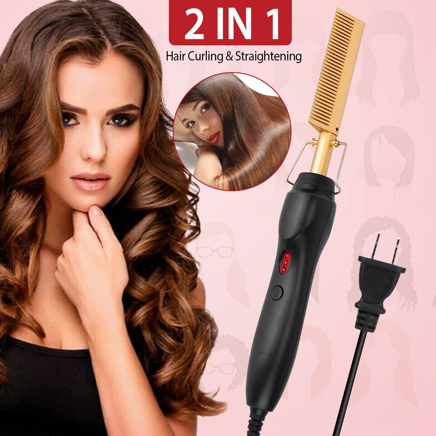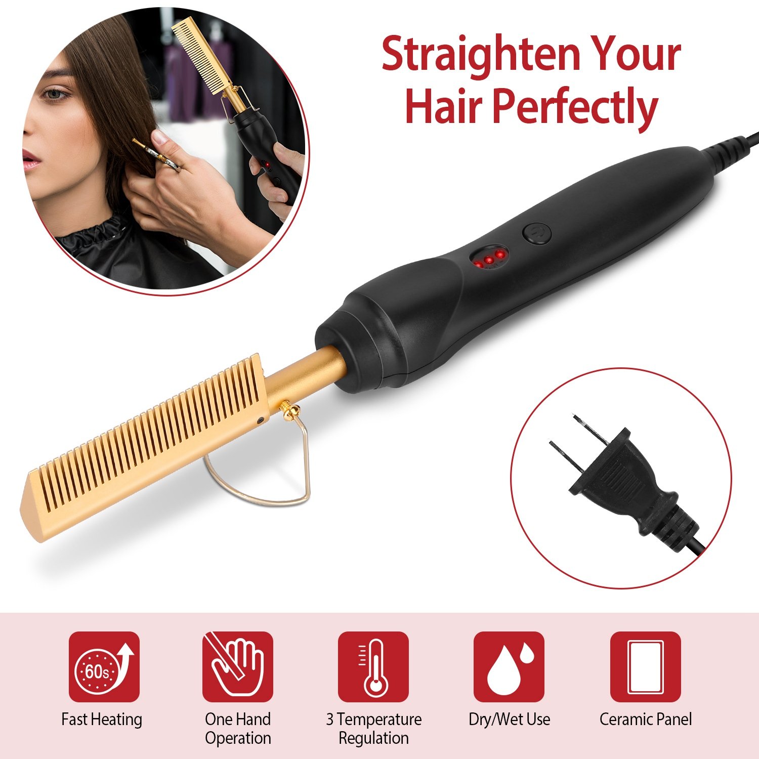 Electric Heating Hair Comb PTC Ceramic Hair Straightener Curler Brush Hair Straight Styler Wet Dry Use w/ 3 Temperature Adjustment