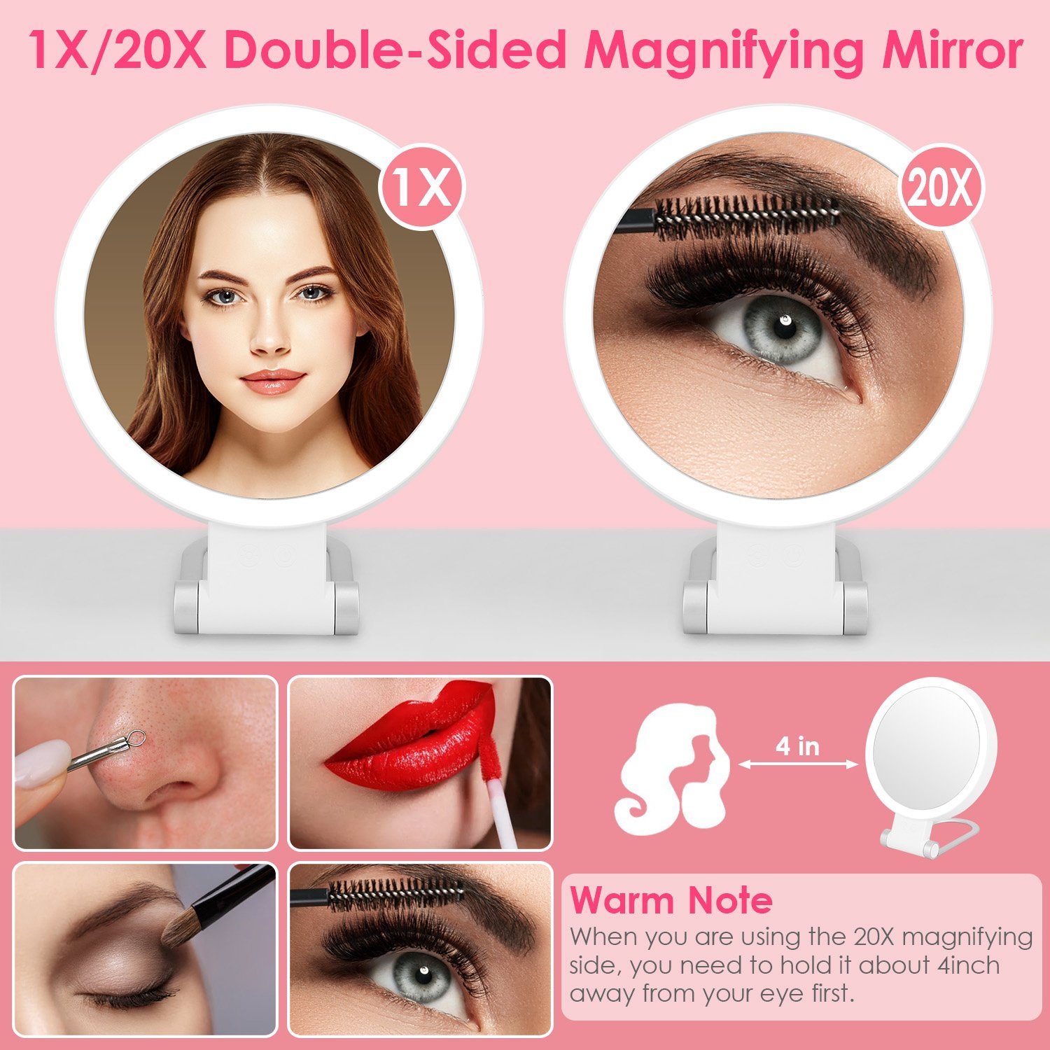 Home > 20X/1X Double-Sided Magnifying Makeup Mirror With Light Rechargeable Travel Makeup Mirror With 3 Colors Dimmable Brightness Adjustable Stand Vanity Ta